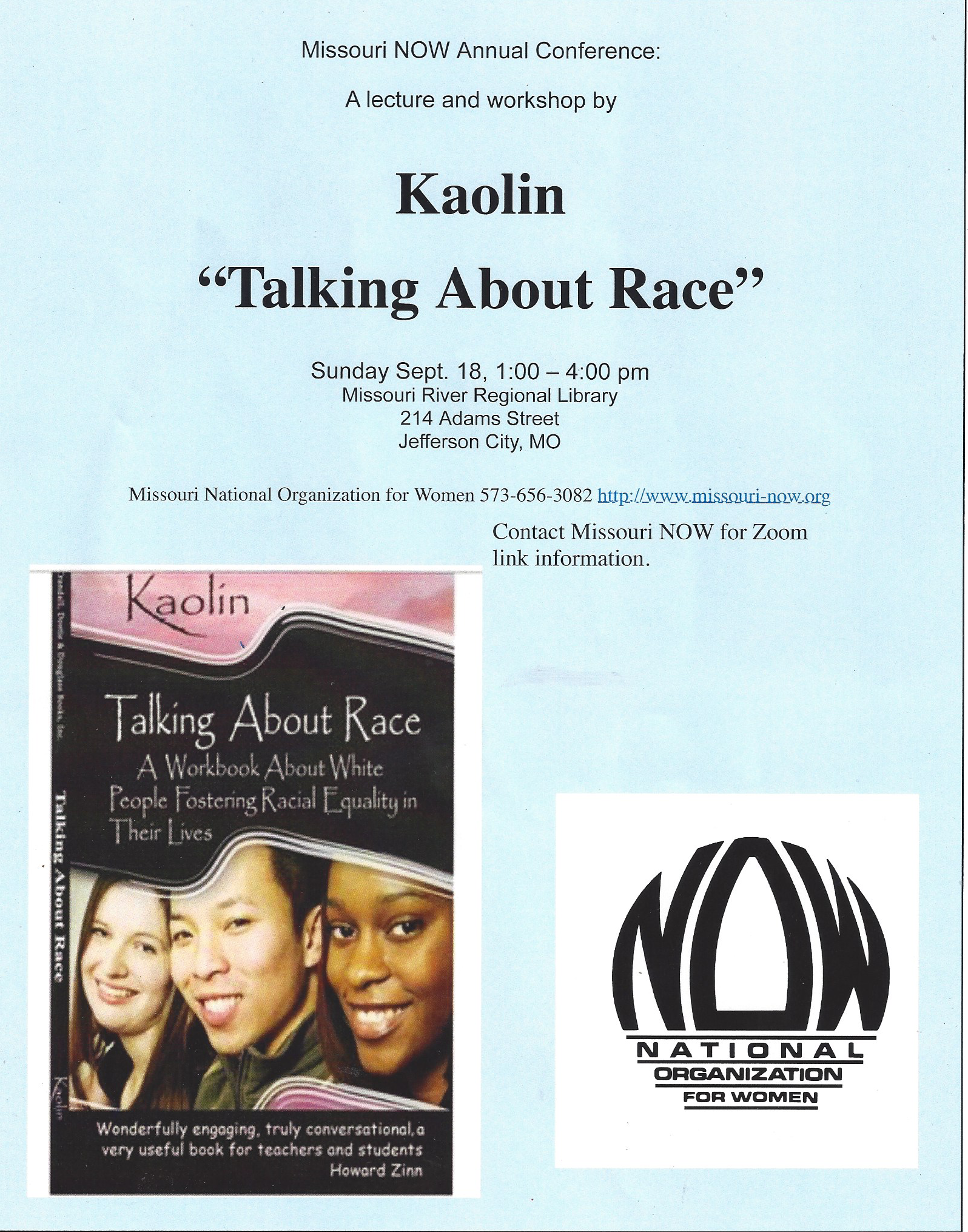 Missouri National Missouri NOW will host a workshop to talk about racism on Sunday, September 18 at the Missouri River Region Library, 214 Adams St, Jefferson City, MO beginning at 1:15 p..m. in the Mark Twain Room. The workshop will be led by Kaolin, is free and open to the public.